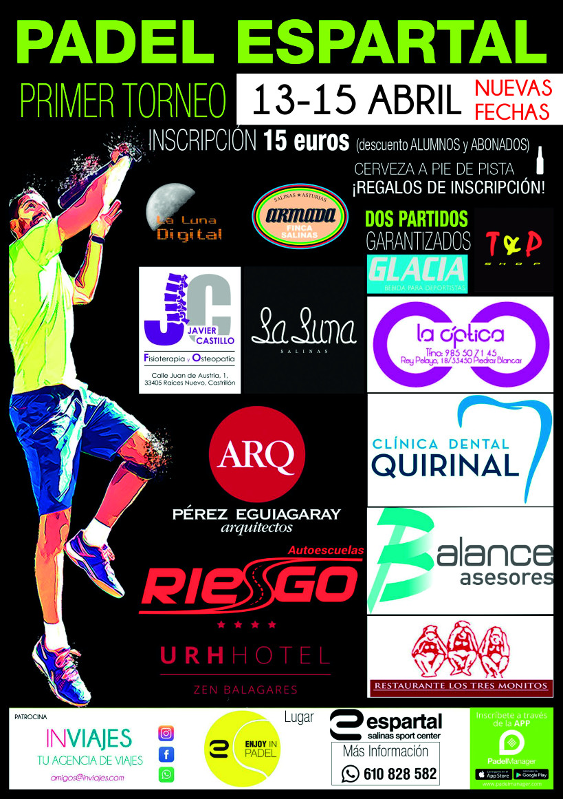 Espartal Sport Center es un centro deportivo situado en Salinas, Castrillón (Asturias). Más de 4.000 metros cuadrados de instalaciones deportivas, con el mejor y más moderno equipamiento, donde recibirán un trato personalizado por parte de nuestra plantilla, formada por los mejores profesionales. Una variada oferta deportiva en unas instalaciones de referencia, ABIERTAS A TODOS LOS PÚBLICOS, a sólo 50 metros de la playa de Salinas. ¡HAZTE SOCIO! Nuestras tarifas se adaptan a ti y a tu estilo de vida. Puedes solicitar más información en el teléfono 985 501 135 o escribiendo al correo electrónico info@clubespartal.com El Espartal EnjoyIn Padel cuenta con una escuela dirigida por profesores titulados con mucha experiencia Clases para todos los niveles Iniciación, Nivel Medio y Competición Se realizan entrenamientos de refuerzo en nuestro gimnasio y contamos con alternativas para entrenar en caso de lluvia. Puede llamar o escribir un WhatsApp al 610828582
